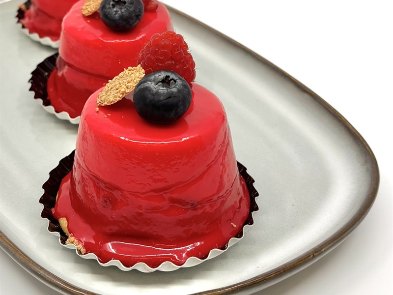 Een bavaroise gebakje met yoghurt, bosvruchten en blauwe bessen.