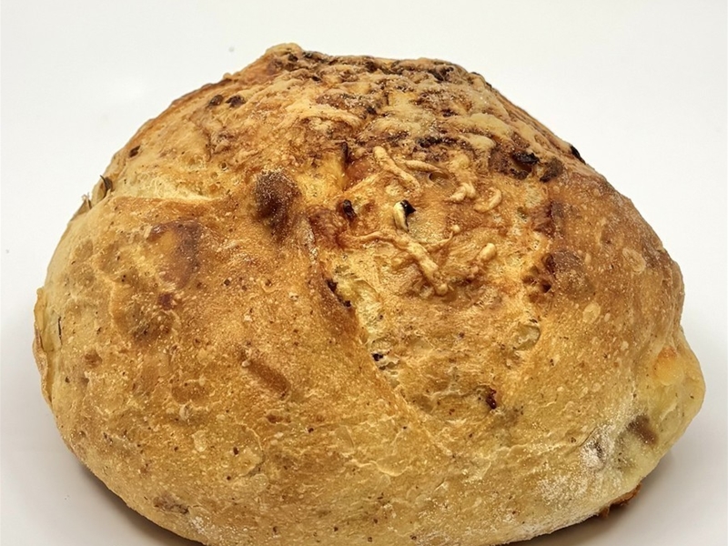 Een witte desem gemaakt van tarwebloem en gevuld met mosterd, oude kaas en een gebakken uitje. Gemaakt met onze eigen zuurdesem starter.